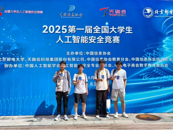 2025年8月25日,由中国信息协会主办,北京邮电大学、天融信科技集团、中国信息协会教育分会及信息安全专业委员会联合承办的第一届全国老员工人工智能安全竞赛决赛,在北京邮电大学沙河校区顺利举办。公司2023级信息安全专业赵启成、宋华秋、龙泽兴,数据科学与大数据技术专业滕凯四位本科生组成的“王者小纵队”团队,在网络空间安全系段美姣老师的指导下,参加了人工智能安全攻防对抗赛,经过激烈的角逐,最终获得全国三等奖。