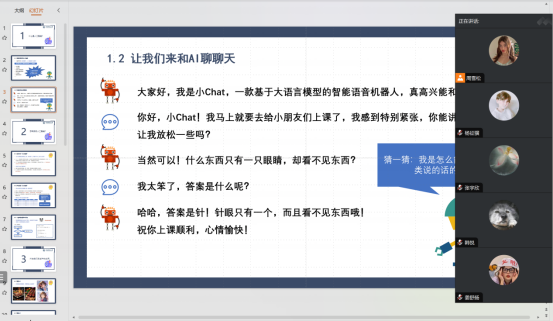 讲座以“探索人工智能的奥秘”为主题,通过互动问答、智能机器人演示和图像生成体验等环节,引导孩子们了解人工智能的基本概念、实现方式以及在日常生活中的广泛应用。活动中,孩子们积极参与,对AI语音机器人小Chat的互动表现出浓厚兴趣。互动问答环节中,孩子们积极举手回答问题,展现出对知识的渴望和追求。通过与小Chat的对话,孩子们体会到了人工智能在语言理解和交流方面的潜力。通过简单的编程示例,孩子们体验了机器学习的基本原理,并对AI在艺术创作、医疗诊断等领域的应用表现出极大好奇。