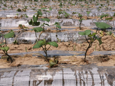另外,我们也注意到薯苗都被盖上一层白色的透明薄膜,对此我们请教了刘文学总经理,他说,这是研究院设计的针对薯苗的特殊保护方式。以前在雨势过大的时候,雨水会把泥土冲走,经过太阳的暴晒后会板结,进而阻碍了薯苗的呼吸,不利于其生长。通过在薯苗下加铺一层薄膜的方式,多余的雨水不会直接冲刷薯苗根部,而是沿着薄膜流到行间的沟里,这就有效解决了雨后泥土板结的问题。听完刘文学总经理的解释后,同学们都大为赞叹,就是在不断的受挫、尝试和摸索中,迸发出了广大农民的智慧!