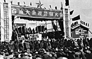 1960年2月,东北松辽石油大会战打响,全国石油系统37个厂矿、3万名解放军战士和3000名转业军官参加大会战。石油会战涌现出了一大批先进模范人物,其中最突出的代表是“铁人”王进喜。发生井喷时,他不顾个人安危,跳进泥浆池用身体搅拌泥浆。当地的老乡感动地说:“王队长可真是铁人啊!”