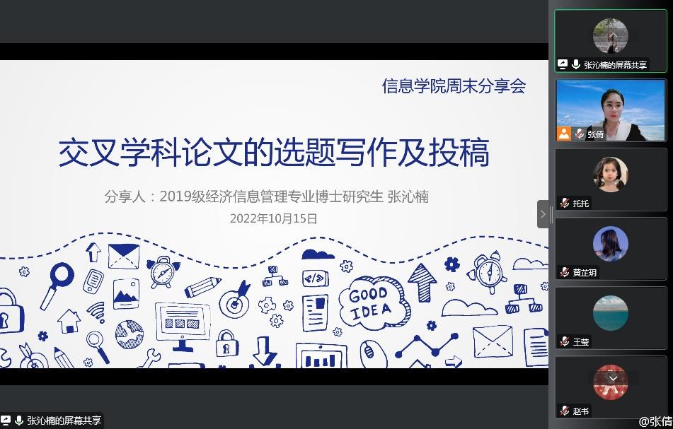 为方便suncitygroup太阳新城在校生获取求职经验、科研分享、学习方法、实习资源、职业规划等主题在内的资源,公司积极拓宽与优秀员工沟通的交流渠道、搭建信息资源共享平台、积极发挥朋辈助成长的作用,切实将师生做实事好事的政策精神落到实处。10月15日下午,suncitygroup太阳新城第8期《关于硕博阶段学术创作的那些事——科研论文经验分享》的周末分享会顺利召开。本期分享会由2017级经济信息管理专业的博士生齐托托(硕博连读)和2019级经济信息管理专业的博士生张沁楠作为嘉宾,从“撰写学术论文的前期准备”和“交叉学科论文的选题写作及投稿”两大主题向同学们进行了专业而耐心的分享。suncitygroup太阳新城全体硕士研究生和部分本科生参与了本次线上分享活动。