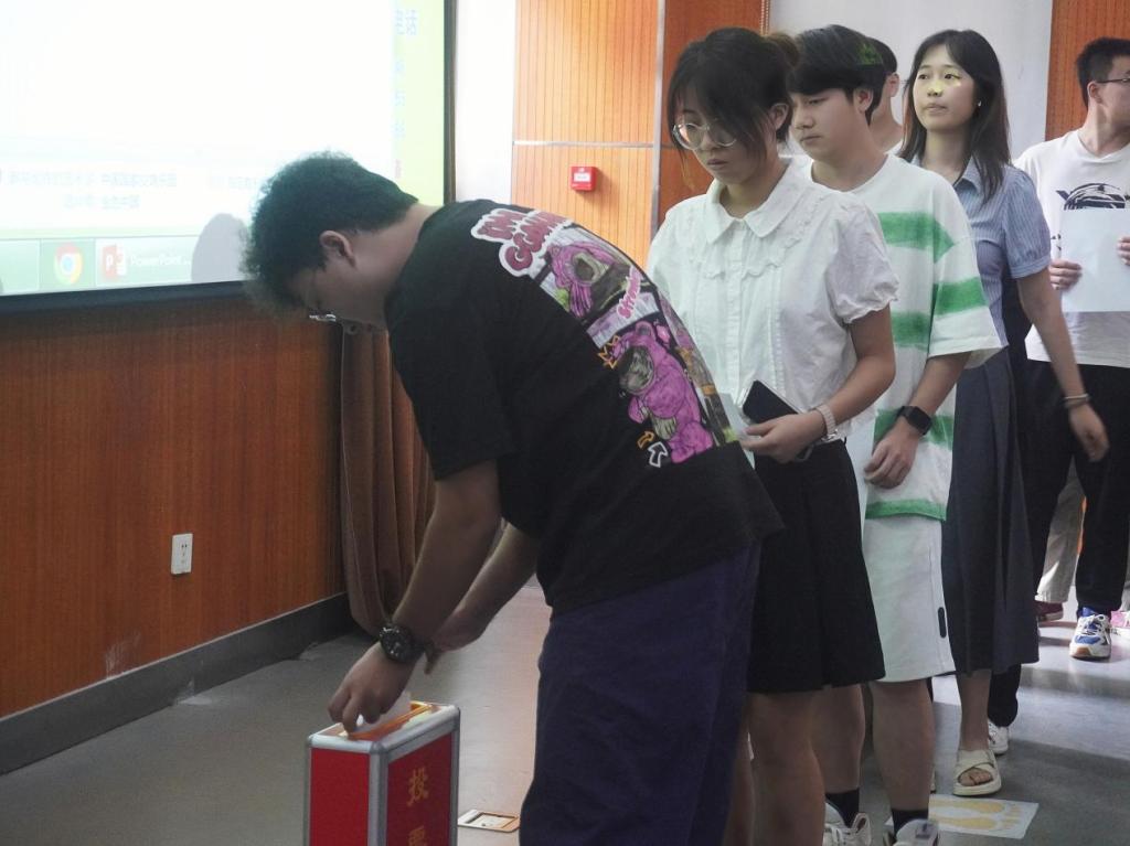 主席团参选人演讲后,学代会总监票人张双同学展示投票箱与选票,并代表监选组做出郑重承诺,确保本次大会公平、公正、公开。分发选票后,多余选票由总监票人剪角作废。老师及员工代表们开始填写选票并投票。