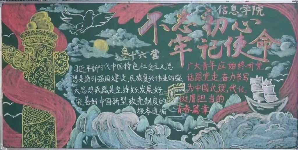 我们学习贯彻习近平新时代中国特色社会主义思想,不忘初心,牢记使命,善作善成,一往无前。经过十六营黑板报策划小组同学的勇敢尝试与创新,为我们大家展现了一幅优秀多彩的青春画卷。