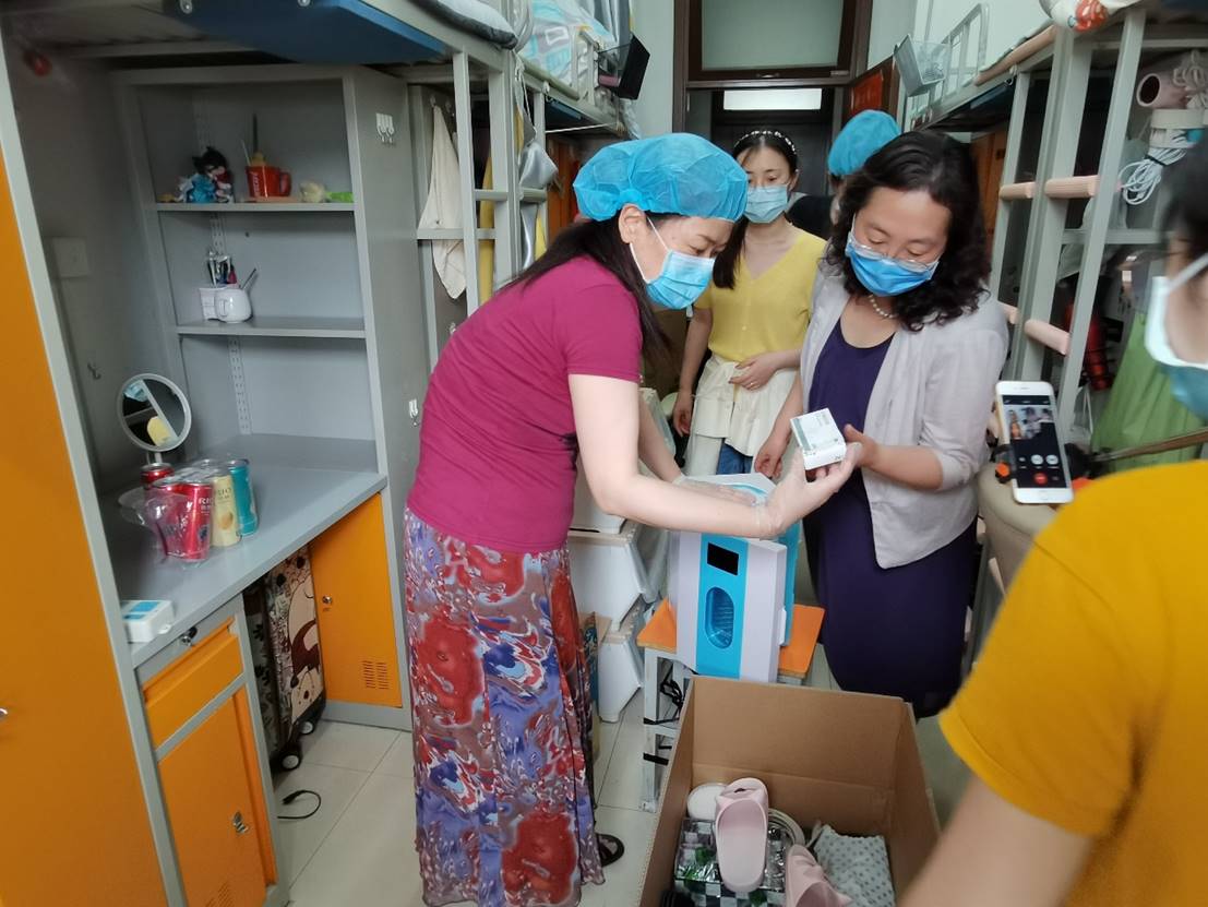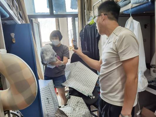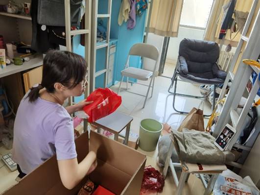 在宿舍内,老师们与员工视频连线、耐心沟通,仔细核对物品,充分按照员工意愿为其整理封装。老师们根据“一对一、点对点”的打包原则,从床上到床下,从门口到阳台,不落下每个角落;大到被子,小到照片,老师们都细心寻找、妥善装箱,每一件行李都记载着老师们对毕业生的不舍与惦念,尽最大努力满足毕业生同学们的多元化需求,用实际行动传递公司对毕业生的深深关切。