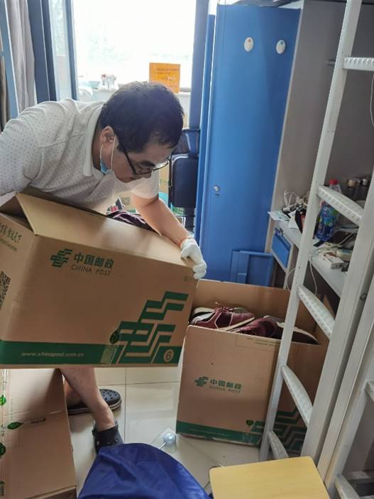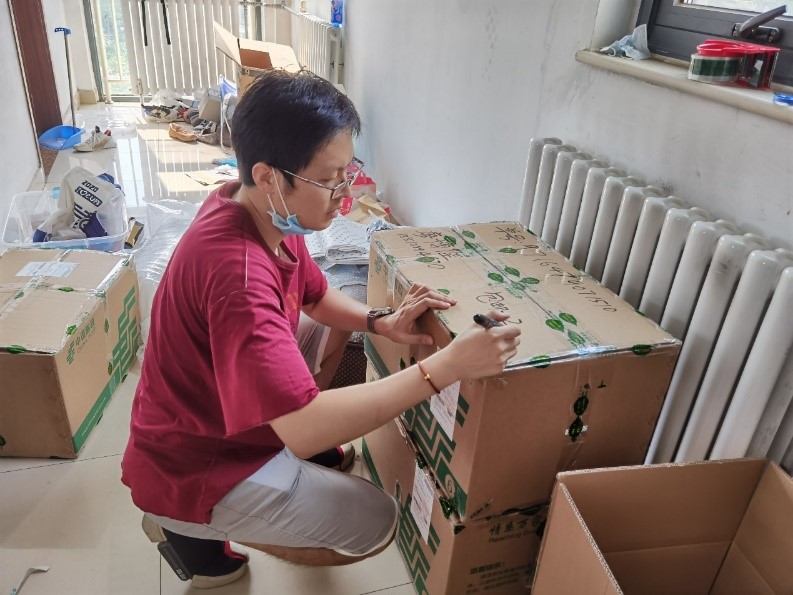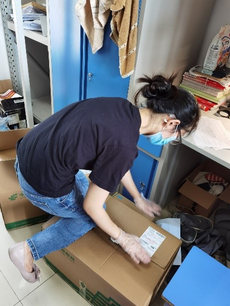 在完成了收集、分类、包装后,老师们细致的在包装箱上写明收件信息,标明包裹内容,为同学们顺利收到包裹保驾护航。