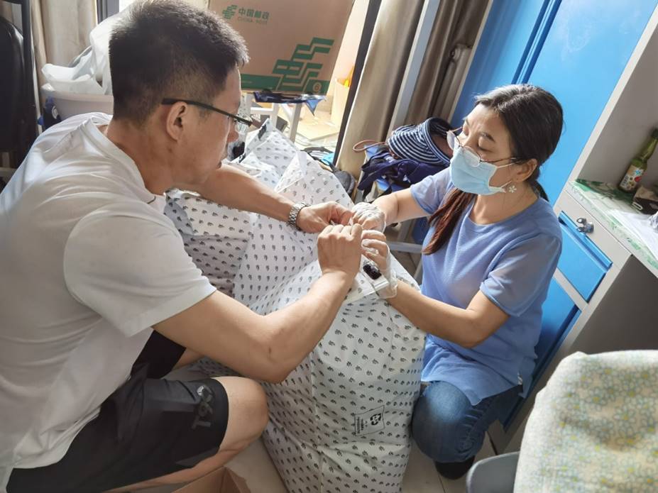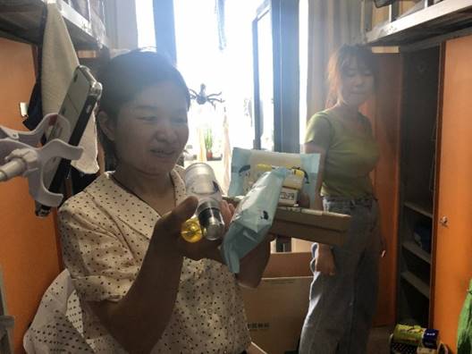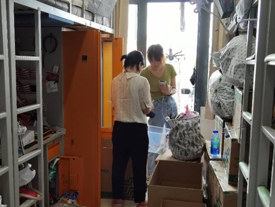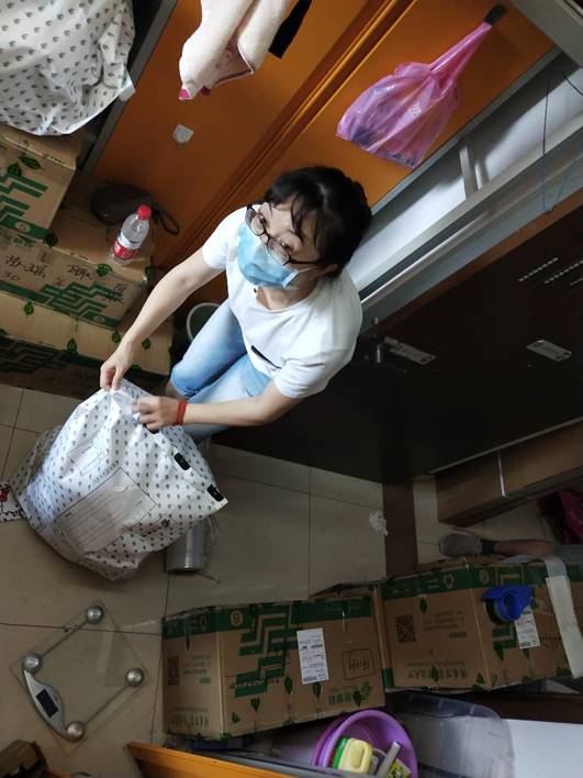 公司教师们积极投入到工作中,与员工们一边视频一边打包行李,一一确认物品存放位置,做好沟通交流,且关注关照员工的需求,周到考虑员工的隐私,在女生宿舍由女老师负责叠放衣物、收拾床铺,男老师负责收拾书籍、搬运物品、封装包裹。