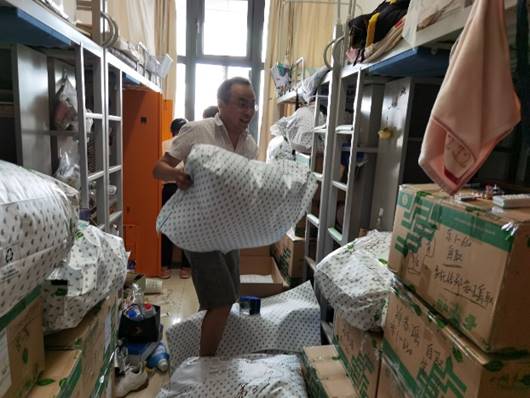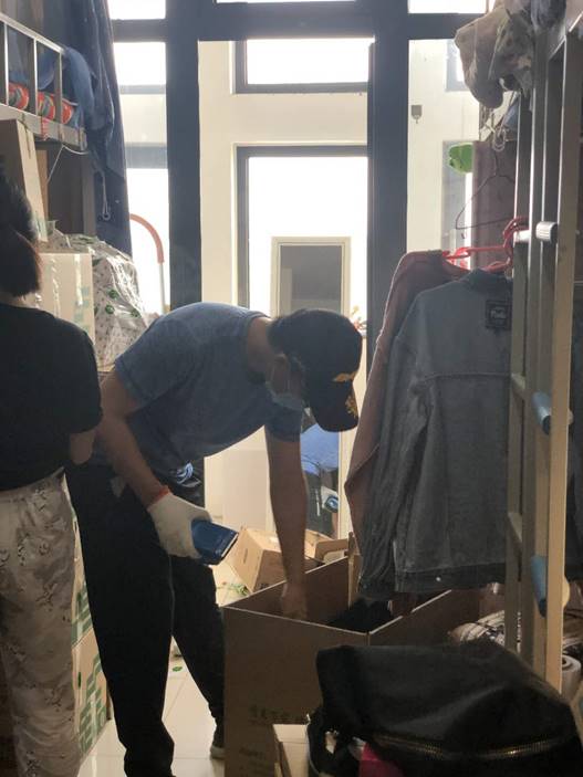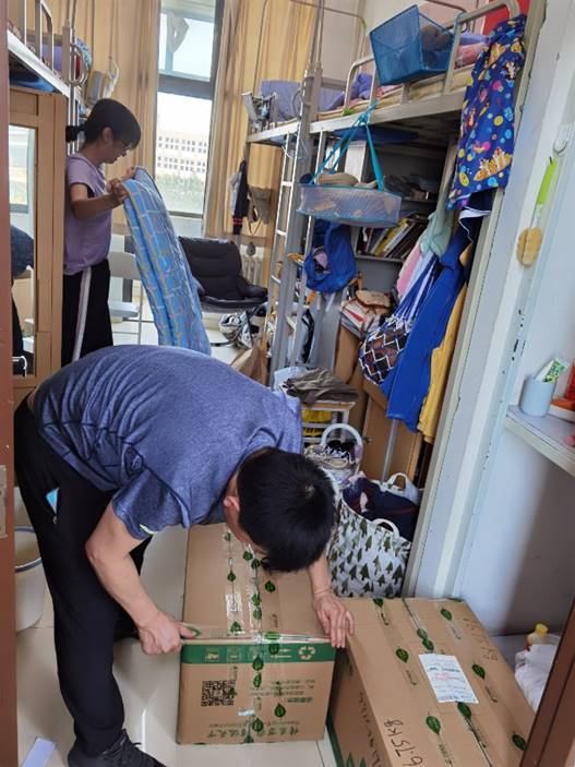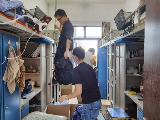 老师们在房间内分类整合、密封箱子。从上铺到桌底,从书桌到窗台,大到铺盖、脸盆,小到充电器,挂饰,无论物品大小,宿舍边边角角的每一件物品老师们都耐心询问,细心处理。