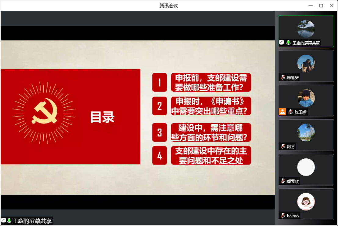 王淼书记以《求真务实,群策群力》为题,从申报“党建工作样板支部”前的准备工作、申报中的重点内容、建设中的注意事项等方面进行了介绍。她认为,申报“党建工作样板支部”,统一党员思想认识是关键,加强支部组织管理是基础,夯实支部组织生活是依托,明确支部工作特色是前提。马克思主义基本原理教研室党支部从5个方面制定了建设方案,一是进一步强化政治引领,推进政治建设标准化;二是进一步规范组织制度,推进组织生活标准化;三是进一步细化管理,推进党员教育管理标准化;四是进一步健全机制,推进工作运行机制标准化;五是进一步增强业务能力,推进服务工作标准化。在“党建工作样板支部”建设过程中,要注意时间节点和相关信息的报送和宣传,对验收清单要做到心中有数。