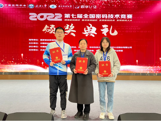 2023年3月16-18日,第七届全国密码技术竞赛决赛在武汉大学国家网络安全公司举行。公司2020级信息安全专业彭睿、石鑫、吴林晨三位同学组成的参赛团队,在领队老师兼指导老师段美姣的带领下参加了比赛,历经初赛、复赛和决赛的激烈角逐,最终参赛作品《基于策略的动态变色龙认证树设计与实现》荣获三等奖。