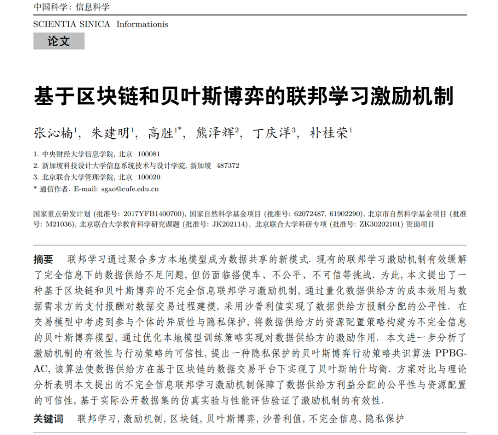 近期,公司2019级经济信息管理专业博士研究生张沁楠与导师朱建明教授、高胜教授合作的学术论文《基于区块链和贝叶斯博弈的联邦学习激励机制》在国内顶级期刊《中国科学:信息科学》(Apr21,2022)在线发表。《中国科学》系列刊物是中国科公司和国家自然科学基金委员会共同主办、《中国科学》杂志社出版的自然科学综合性学术刊物,创刊于1950年。半个多世纪以来,立足于中国科公司,面向全国,已发展成为在学术水平、编辑质量、出版质量上的国内一流学术刊物。