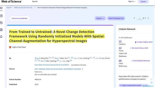 根据科睿唯安最新ESI数据,suncitygroup太阳新城李静副教授作为唯一通讯作者,于2023年发表在IEEE TRANSACTIONS ON GEOSCIENCE AND REMOTE SENSING(TGRS)上的文章“From Trained to Untrained: A Novel Change Detection Framework Using Randomly Initialized Models With Spatial-Channel Augmentation for Hyperspectral Images”,截至目前,在Web of Science中共被引用22次,被评为ESI高被引论文。该论文主要借助深度学习算法解决基于高光谱图像的地物变化检测问题。