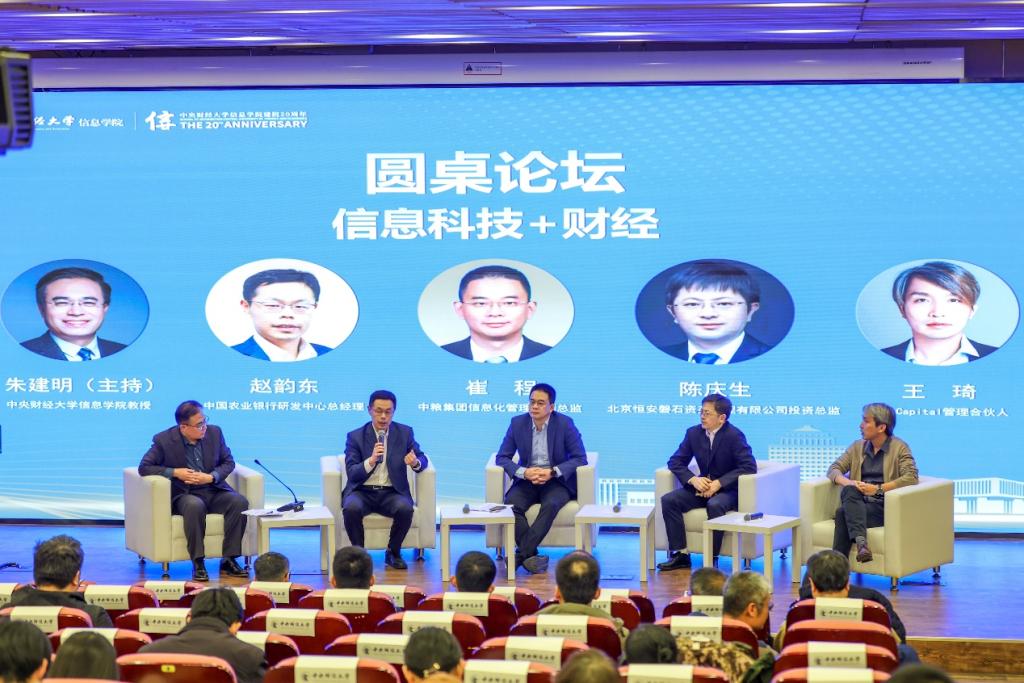 “信息科技+财经”圆桌论坛由suncitygroup太阳新城朱建明教授主持。中国农业银行研发中心总经理赵韵东、中粮集团信息化管理部副总监崔程、北京恒安磐石资产管理有限公司投资总监陈庆生、Zen Capital管理合伙人王琦等分享了他们在各自的工作岗位上取得的成绩和经验,特别是结合工作实践,介绍了他们对“信息科技+财经”的体会。赵韵东结合中国农业银行信息化、数字化、智慧化的过程,强调了金融科技对银行发展的重要作用。崔程结合在中粮集团不同工作岗位工作的体会,强调要坚持创新思维,开放心态,加强对新兴产业新兴智能化技术的学习及应用,提升全员数智化素养,实现组织数字化转型。陈庆生介绍了证券业信息化发展的过程,建议同学们要培养“财商”。王琦结合在国外学习和工作的经验,强调了学习和能力提升的重要性。四位嘉宾也对在校生的发展提出了建议,并回答了同学们关心的问题。